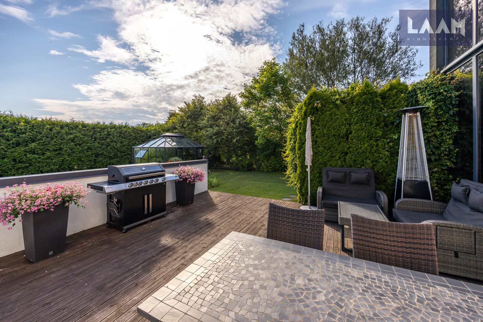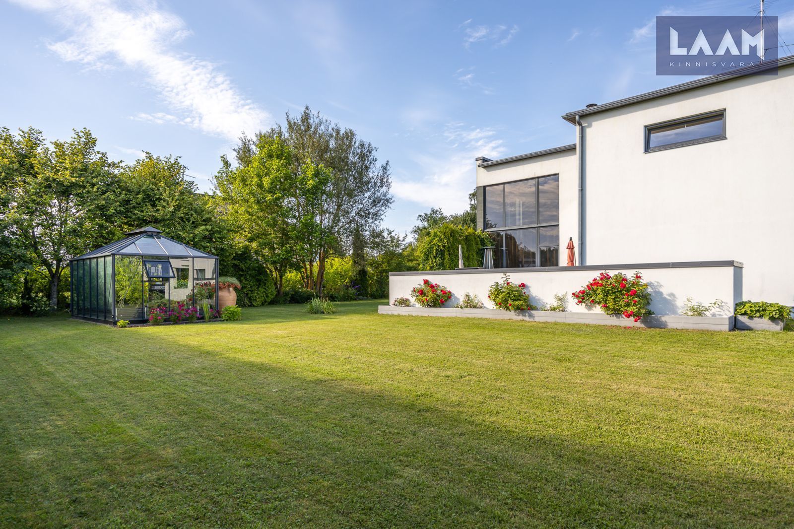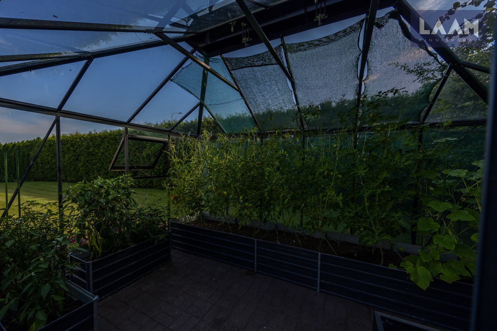 Tegemist on kõrghaljastusega krundiga, mis on piiratud erinevat tüüpi hekkide ja aiaga. Kasvavad viljapuud ja põõsad. Aias on ka 13 m2 suurune moodne Juliana Pavilion Grand Oasis kasvuhoone, mis sobib hästi ka talveaiaks. Maja küljes asub elupuuhekiga piiratud 47 m2 terrass koos aiamööbli ja suure grilliga.