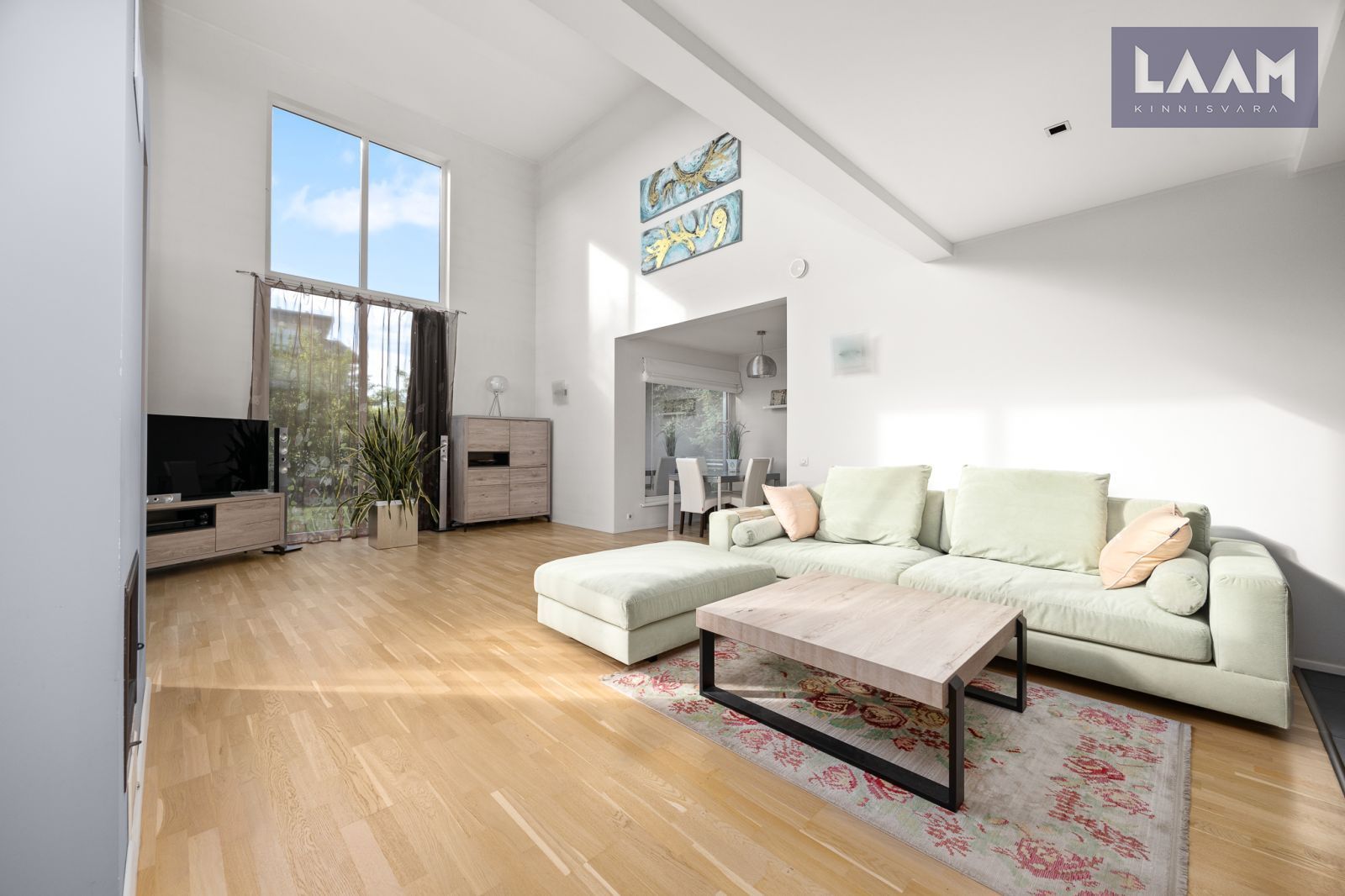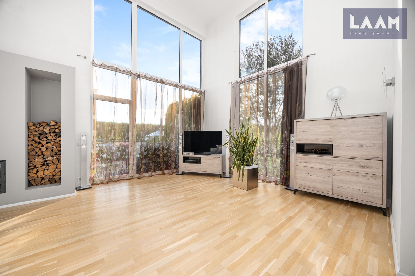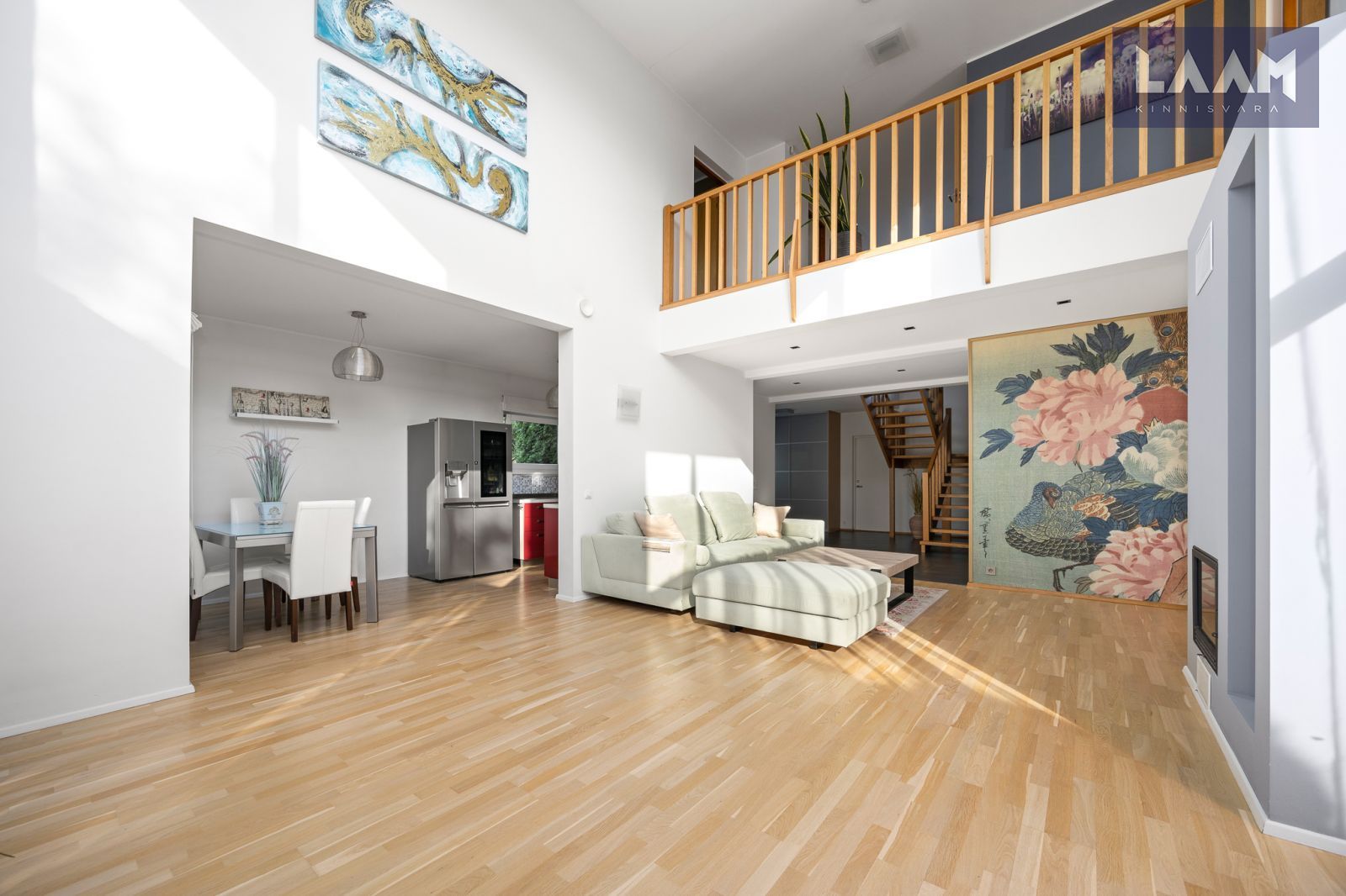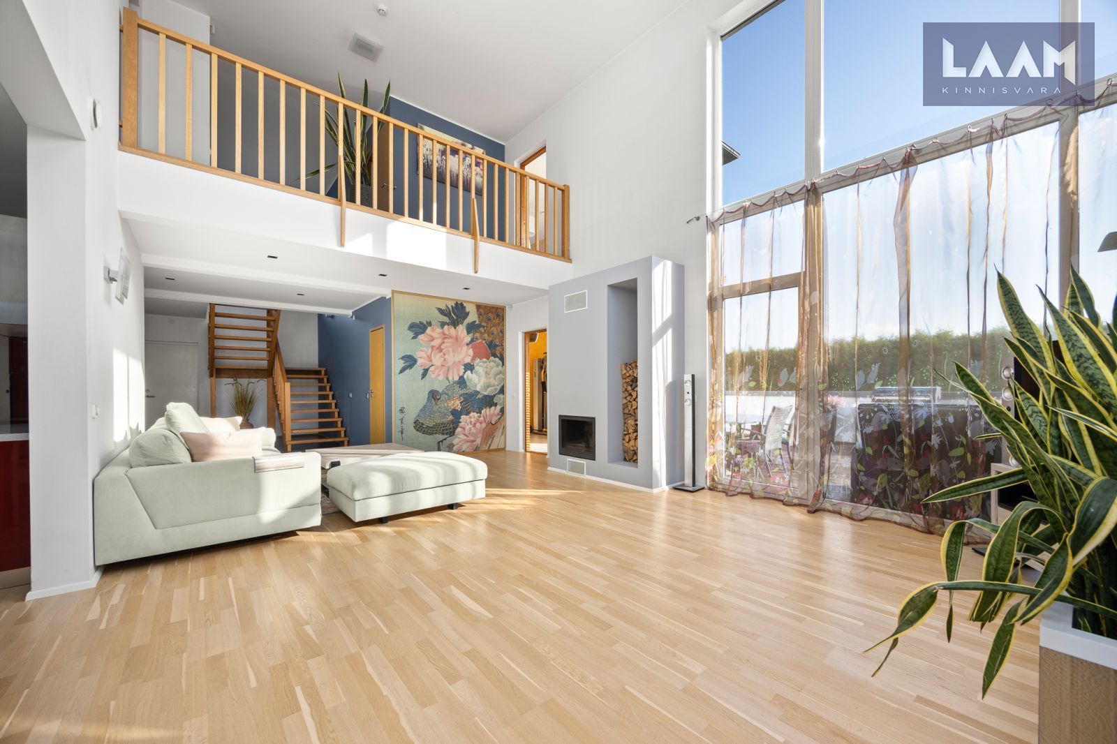 Avar elutuba, kus pilk tõuseb koos ruumiga – läbi kahe korruse kõrguvad klaasaknad toovad valguse ja avaruse igasse päeva.