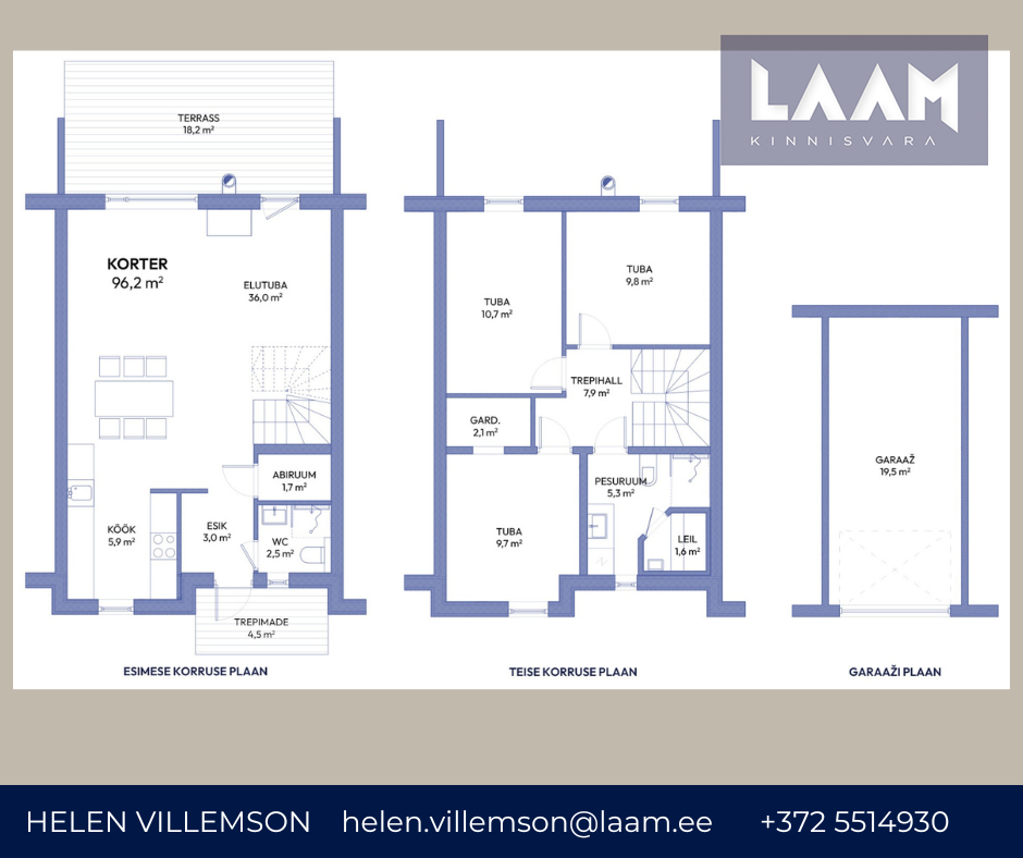 Esimesel korrusel asuvad ka esik, majapidamisruum ning WC/duširuum. Teisel korrusel asuvad 3 magamistuba ning saunaga duširuum.