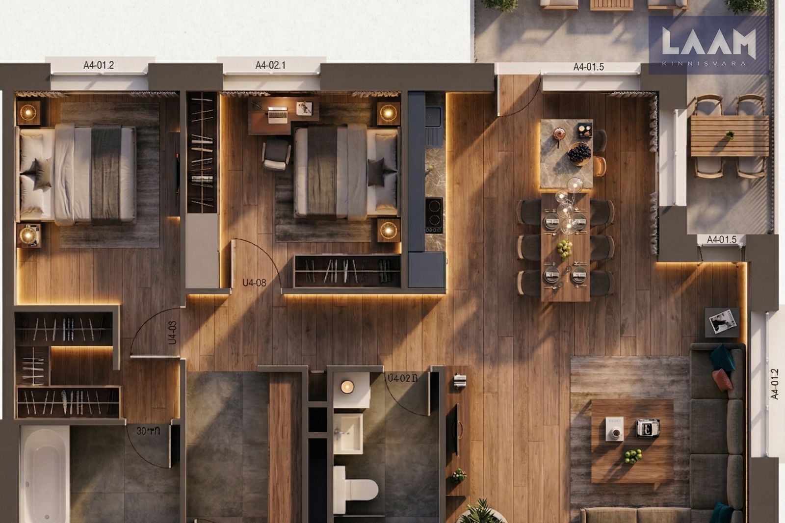 3 tuba: elutuba-köök 36,9 m², 2 magamistuba (14,6 ja 11,4 m²)